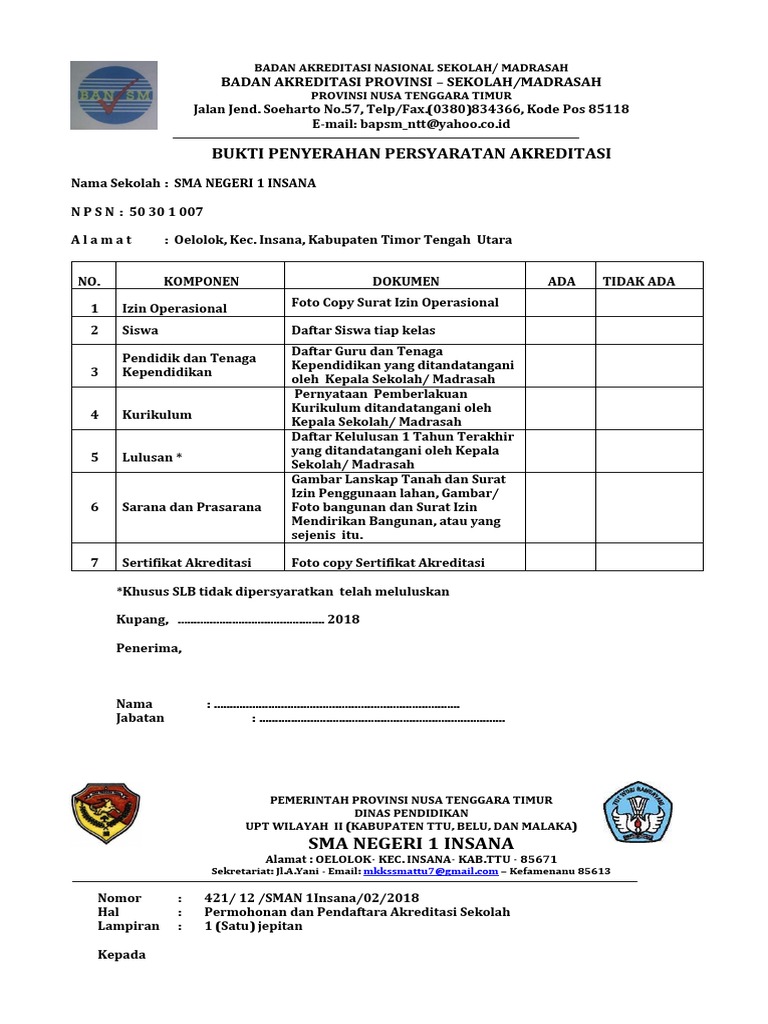 Berdasarkan permendikbud nomor 59 tahun 2012 (pasal 1 ayat 2) badan akreditasi nasional sekolah/madrasah adalah badan evaluasi mandiri yang menetapkan kelayakan program dan satuan pendidikan jenjang pendidikan dasar dan menengah jalur formal dengan mengacu pada standar nasional pendidikan. Contoh surat permohonan mutasi dalam dunia kerja mutasi adalah hal yang lumrah kita temukan. Teknik kendaraan ringan akreditasi b 2. Sk tim persiapan akreditasi sekolah sdmi tahun pelajaran 20182019 ini adalah salah satu contoh surat keputusan pembagian tugas dalam hal melaksanakan akreditasi supayaberjalan dengan baik dan lancar sesuai dengan yang diharapkan oleh pihak sekolah. Hal ini menandakan adanya kesiapan bagi sekolah dalam melaksanakan persiapan dalam penilaian akreditasi nantinya (visitasi). Akte kelahiran / surat keterangan lahir asli dari dinas. Misalnya saja pernyataan tertulis dari atas nama sekolah. Contoh surat pengajuan akreditasi sekolah sma yang bisa bapak ibu gunakan dan diunduh secara gratis dengan menekan tombol download biru dibawah ini. Contoh surat keterangan rekomendasi jurusan atau peminatan jasa pembuatan administrasi bp/bk di sekolah dan ptk/bk hubungi kami di 081. Khusus sma swasta harus melampirkan: Ada 2 dua contoh surat permohonan penggantian ijazah dalam bentuk words docx untuk jenjang sd smp sma smk. Panduan sisnpena paud 2018 demikian contoh surat pernyataan kebenaran dokumen akreditasi sekolah madrasah. Contoh terbaru contoh surat akreditasi sekolah.download file format.docx microsoft word.